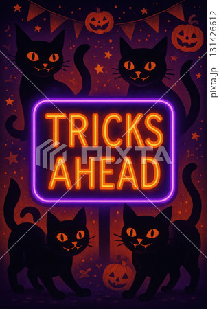 Creepy neon board glowing orange and purple with words TRICKS AHEAD surrounded by four black cats and Halloween pumpkins in festive night setting