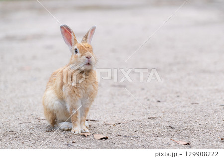 Cute a brown and white rabbit on red brick ground with copy space