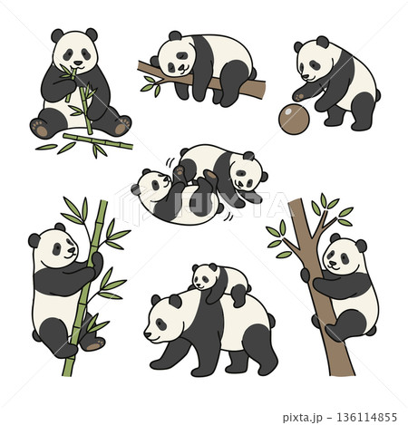 熊貓父母和幼崽以及各種姿勢的插圖集