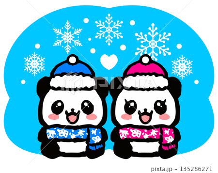 熊貓夫婦戴著冬季圍巾的塗鴉插畫