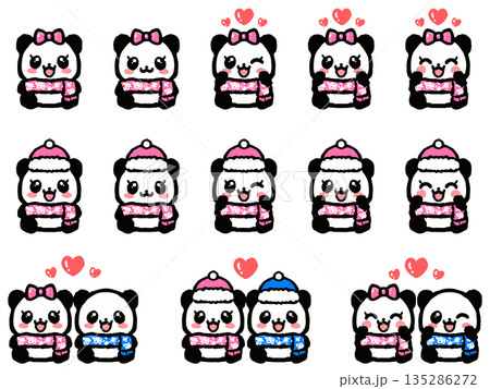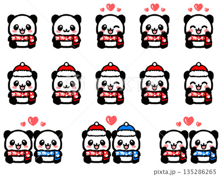 一套可愛的熊貓冬裝坐姿塗鴉插畫素材。