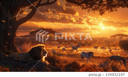 夕陽西下,草原上的獅子,動漫風格