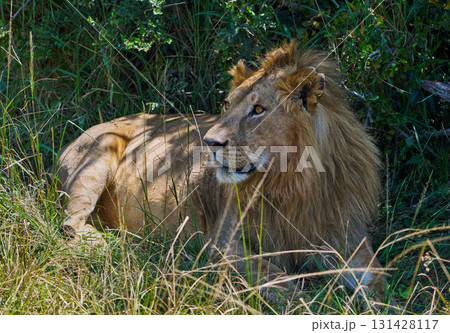 一隻雄獅在草地上休息的特寫鏡頭(塞倫蓋蒂)