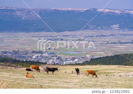 靜岡縣富士宮市朝霧高原牧場的奶牛和富士山的壯麗景色