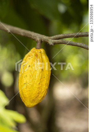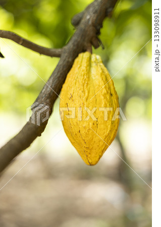 Cacao Tree (Theobroma cacao). Organic cocoa fruit pods in nature.