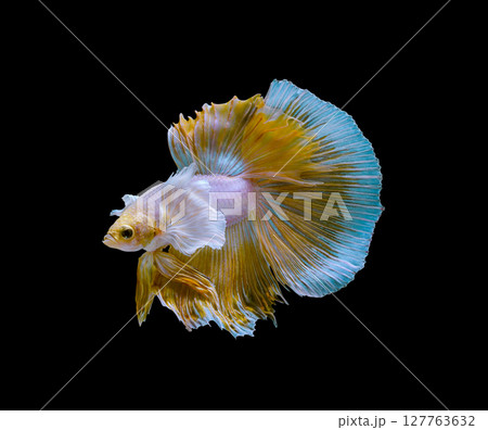 Yellow and blue half moon big ear Betta splendens fish (Siamese fighting fish) on black background
