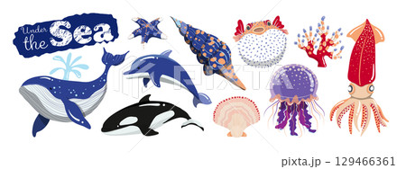 A pack of marine life images, hand-drawn style set