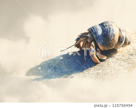 [水彩風格的寄居蟹插圖]站在沙灘上的可愛夏日海濱景色