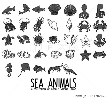Sea Animals Related Doodle vector icon set. Drawing sketch illustration hand drawn line eps10