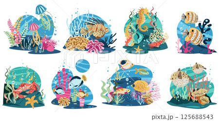 Flat cartoon vector illustration set of colorful fish and exotic sea animals in kids style. Coral reef underwater world with ocean wildlife, sea plants, marine creatures, shells for childrens designs