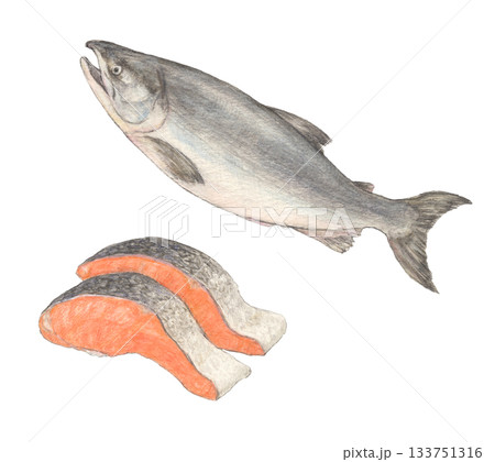 鮭魚與鮭魚片水彩鉛筆畫