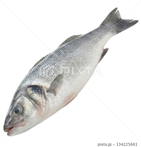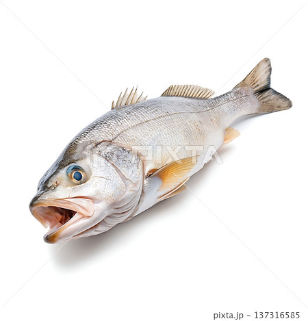 Fresh sea bass fish raw seafood whole fish white background studio closeup texture scales fins healthy culinary inspiration