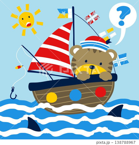 Little cat on sailboat under shark attack in the ocean ,vector cartoon illustration