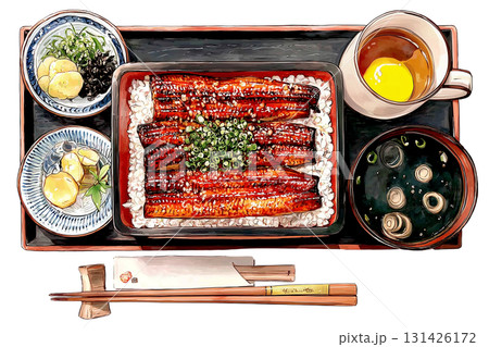 Unadon, Grilles eel on rice plate, hand-drawn watercolor painting illustration