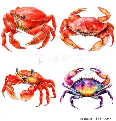 Watercolor art collection of four vibrant and detailed crabs isolated on white background