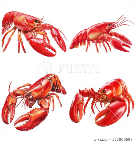Four red lobsters displayed on a white canvas isolated on white background
