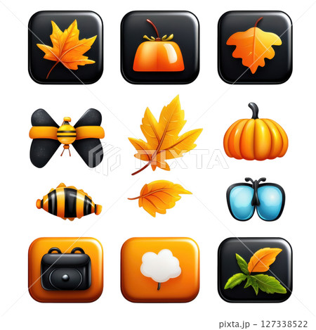 Collection of autumn themed icons featuring leaves, pumpkins, and bees in vibrant orange and black colors. Perfect for seasonal