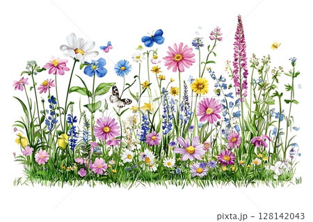 Colorful Wildflower Meadow with Butterflies and Bees in Bright Spring Landscape Design