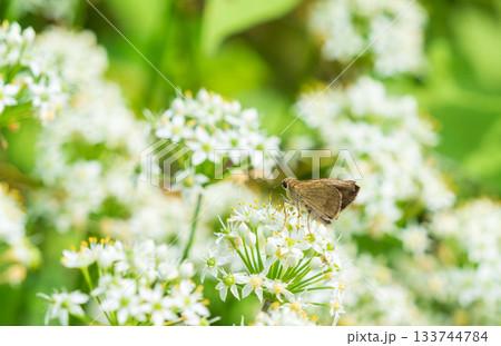一隻栗色蝴蝶來到了豐川市東三河故裡公園的藤葉花前。