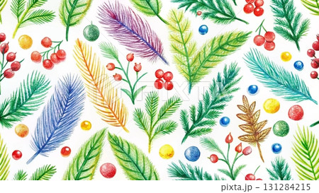 Seamless pattern, childlike doodle watercolor style, messy green scribble pine leaves background