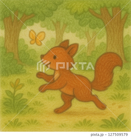 森林裡松鼠追逐蝴蝶的插圖 | 童話風格的可愛動物角色 | 松鼠追逐蝴蝶的插圖