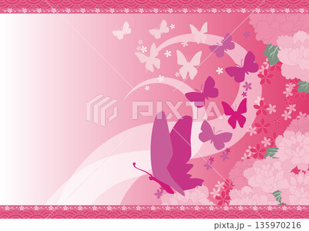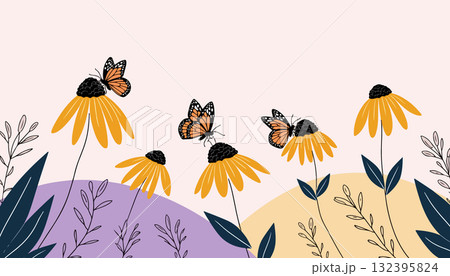 日式背景插畫,櫻花花瓣和翩翩起舞的黃色蝴蝶。