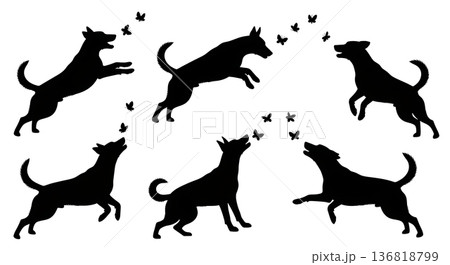 Black Solid Dog Chasing Butterflies Silhouettes Set of Six on White Background