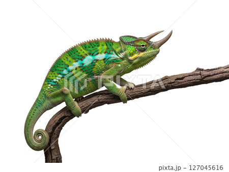 Colorful chameleon perched on a branch with budding leaves isolated on a white background. Vibrant reptile with detailed patterns, ideal for wildlife and nature designs.