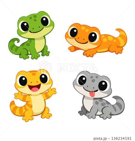Cute cartoon gecko set adorable reptile character happy expression
