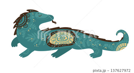 Stylized vector illustration of an iguana decorated with ethnic tribal ornaments. Decorative reptile design isolated on white background.