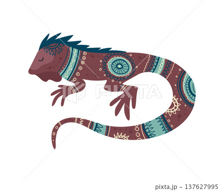 Stylized iguana decorated with ornamental ethnic patterns. Vector illustration of tropical reptile isolated on white background.