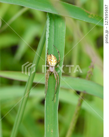 生物:蜘蛛:圓蛛,四月在樹林中。綠色的腿和白色的腹部,有獨特的圖案