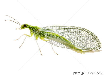 A detailed macro view of a bright green lacewing insect with transparent wings against a white background