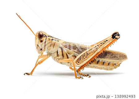 A tan grasshopper poses on a white background with its legs bent and antennae extended