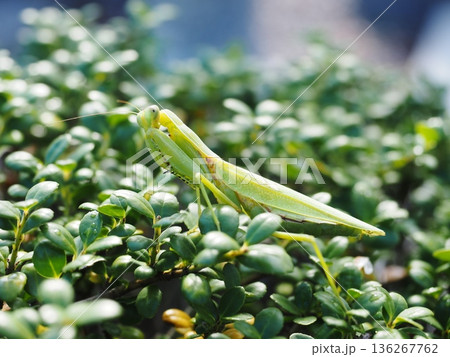 成年螳螂在繡球花葉上休息