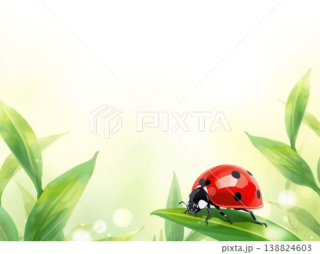 一幅色彩明快的自然插圖,描繪了一隻瓢蟲棲息在嫩葉上,背景是春天的景象,並留有文字空間。