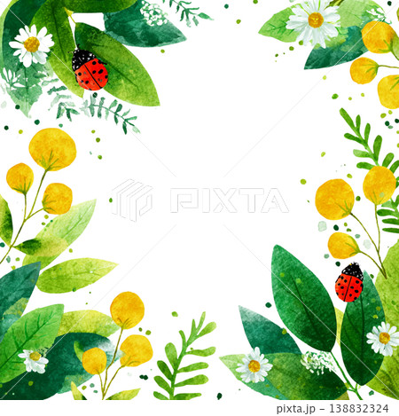 瓢蟲和小花自然邊框,可愛的水彩風格植物背景