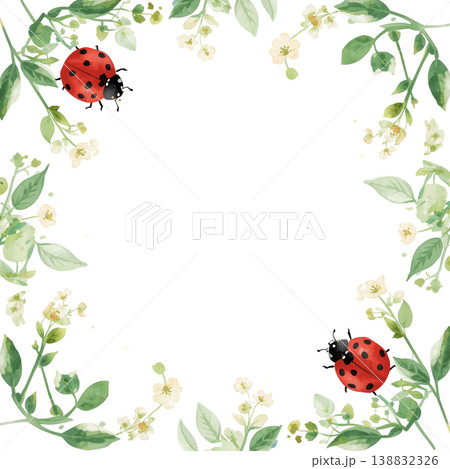 充滿活力的植物背景,以花朵上的瓢蟲和水彩花朵為特色,並留有文字空間。