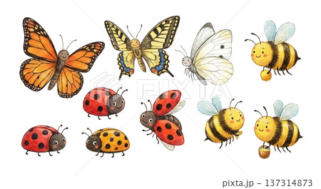 蝴蝶、花朵和瓢蟲的水彩插圖
