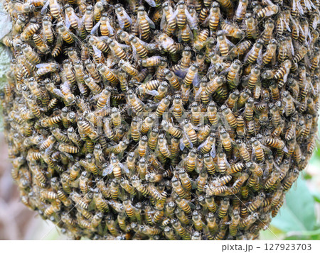 Swarm of bees clings to a concrete wall, Yellow and black pattern of Eastern or Asiatic or Asian honey bee