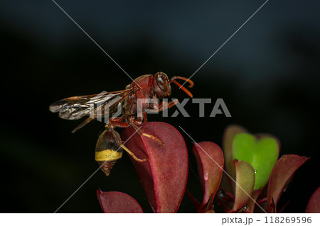 Close up of a red paper wasp on a green leaf.