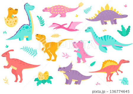 Cute dinosaurs isolated objects set. Collection of different types of colorful dinosaurs, dino baby in egg. Funny prehistoric jurassic reptiles. Vector illustration of design elements in flat cartoon