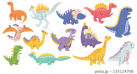 Cute childrens dinosaurs set. carnivorous, herbivorous and flying dinosaurs of illustration