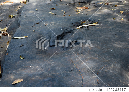 Top view of dinosaur footprints Three-toed predatory species Carved in black natural stone.