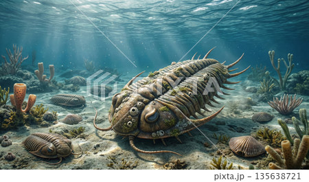3DCG繪製的三葉蟲插圖,它們是古生代海洋的統治者。這是對一種生活在恐龍之前的已滅絕動物的逼真化石復原。