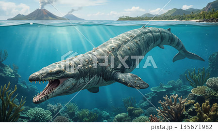 這是一幅以3D CG技術繪製的巨型白堊紀海龜原海龜(Protostega)的插圖,逼真地再現了恐龍時代的海洋生物。