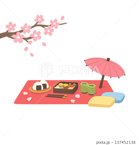 春日插畫,描繪了一個家庭在櫻花樹下共度美好時光的場景。