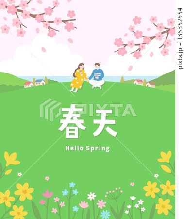 Hello Spring Cherry Blossom Couple Romantic Date Lake Field Vector Illustration