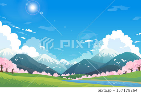 一幅描繪春日景色的插圖,雪山聳立,櫻花樹成排盛開_橫向