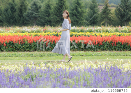 散步在花田的婦女